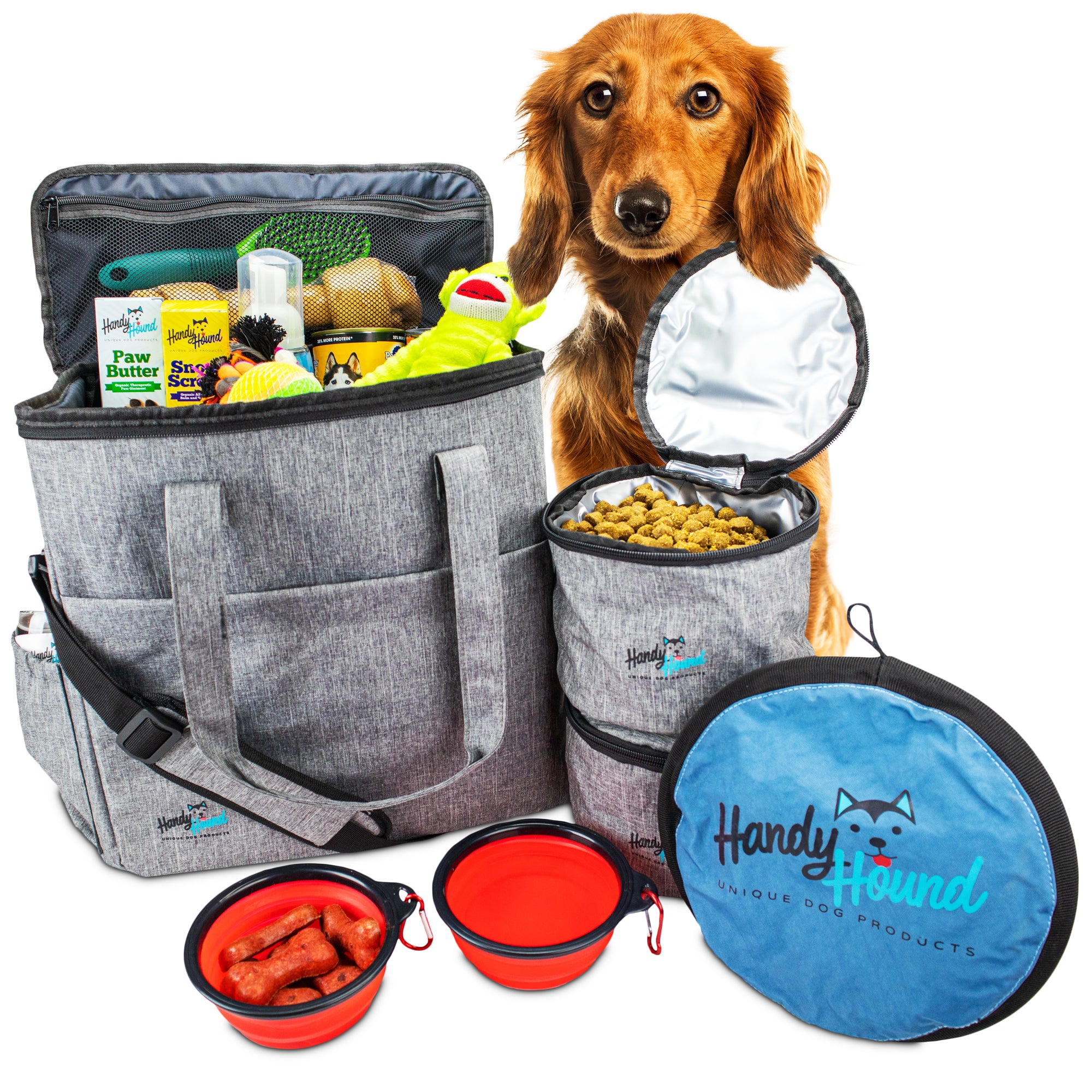 Handy Hounds Pet travel bag holds all of your pets' necessities (Food, medicine, toys, leash, and favorite blanket) while you travel. This bag is the perfect bag for travel, whether it’s long-term or for a weekend getaway. Ideal for camping, hikes, or the dog park.